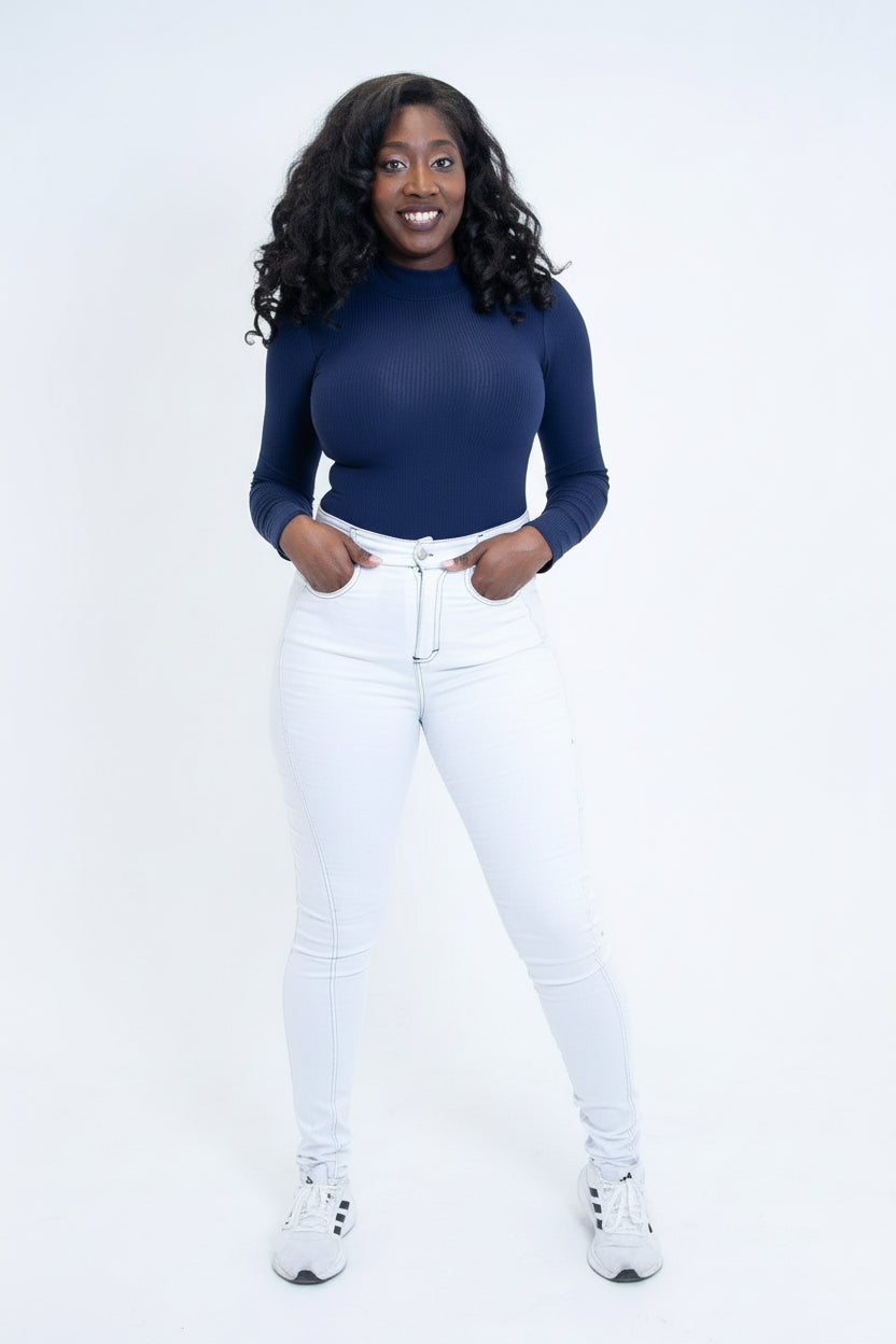 Remanufactured for an even more form flattering fit. Available in white with dark blue top stitching.